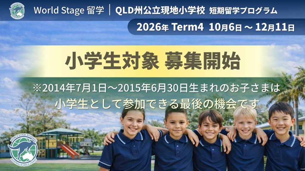 2026年秋(10月~12月) 現地公立小学校短期留学について オーストラリア・ゴールドコーストの公立小学校に通う短期留学プログラムのご案内です。2026年の第4学期(Term…